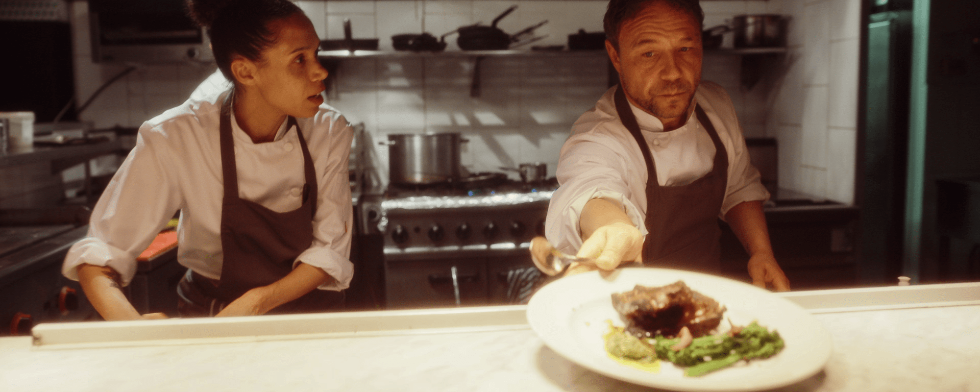 Como entrante, un revuelto; un inspector de sanidad ha aparecido por sorpresa y comunica la bajada de la calificación del restaurante, faltan productos en cocina, el comedor va a estar más lleno de lo habitual, esa noche habrá una pedida de mano y un antiguo compañero chef (ahora celebridad televisiva) de Andy ha reservado una mesa para la cena. La velada no va a ser tranquila, desde luego. Como plato principal, el cordero (debe estar rosado, pero se pide un poco más hecho, no hay que cocinarlo de más, pues no permitirá disfrutar correctamente los sabores de la carne). El desastre. El centro de la película lo ocupan los peligrosos niveles de estrés laboral, la presión a cubrir las expectativas de un número excesivo de clientes —improcedentes y ridículas o demasiado altas. Como postre, una crema de limón un poco agria; los problemas se van cerrando pero la acidez rebrota en el final de la cinta. La cinta aprovecha el guion al máximo en un menú de tres platos y lleva a su protagonista, como una olla a presión sin atención y cuidado adecuados, a acabar sobrepasado tras alcanzar el punto de ebullición.