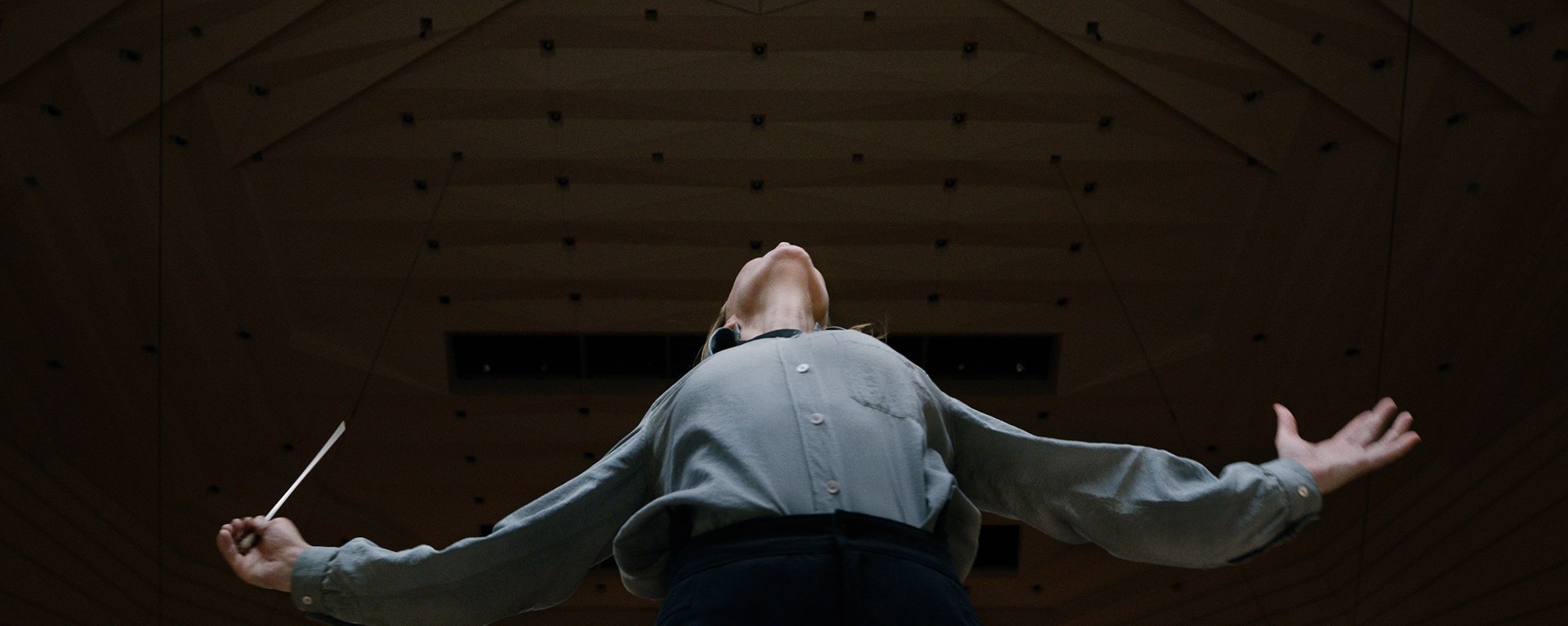 A través de la forma descubrimos que la imagen pública de Lydia Tár es una prolongación de su vida privada, que no hay separación. Los planos secuencias o los viajes en coche (la posición de la cámara en ellos revela el nivel de poder que puede ejercer) unen ambos mundos; a eso se suma la omnipresencia de puertas (en muchas ocasiones, siendo el vano solo, sin la puerta en sí), cristaleras y espacios diáfanos que hablan de lo transparente que realmente es ella. Por si no fuera suficiente, lo rectilíneo de las composiciones y la paleta fría y gris se comparten en sendas esferas, es decir, es imposible separar a Lydia Tár directora de orquesta de la Lydia Tár persona; es imposible separar arte y artista. Es más, si atendemos a los créditos iniciales, que alteran la jerarquía tradicional (empezando por los agradecimientos y terminando por el director), y las segundas lecturas que se abren en algunas escenas a medida que aprendemos más del personaje (la escena en la casa de su infancia es particularmente reveladora) sí podemos afirmar que hay una voluntad de ejercicio de contra-poder y de revisionismo.