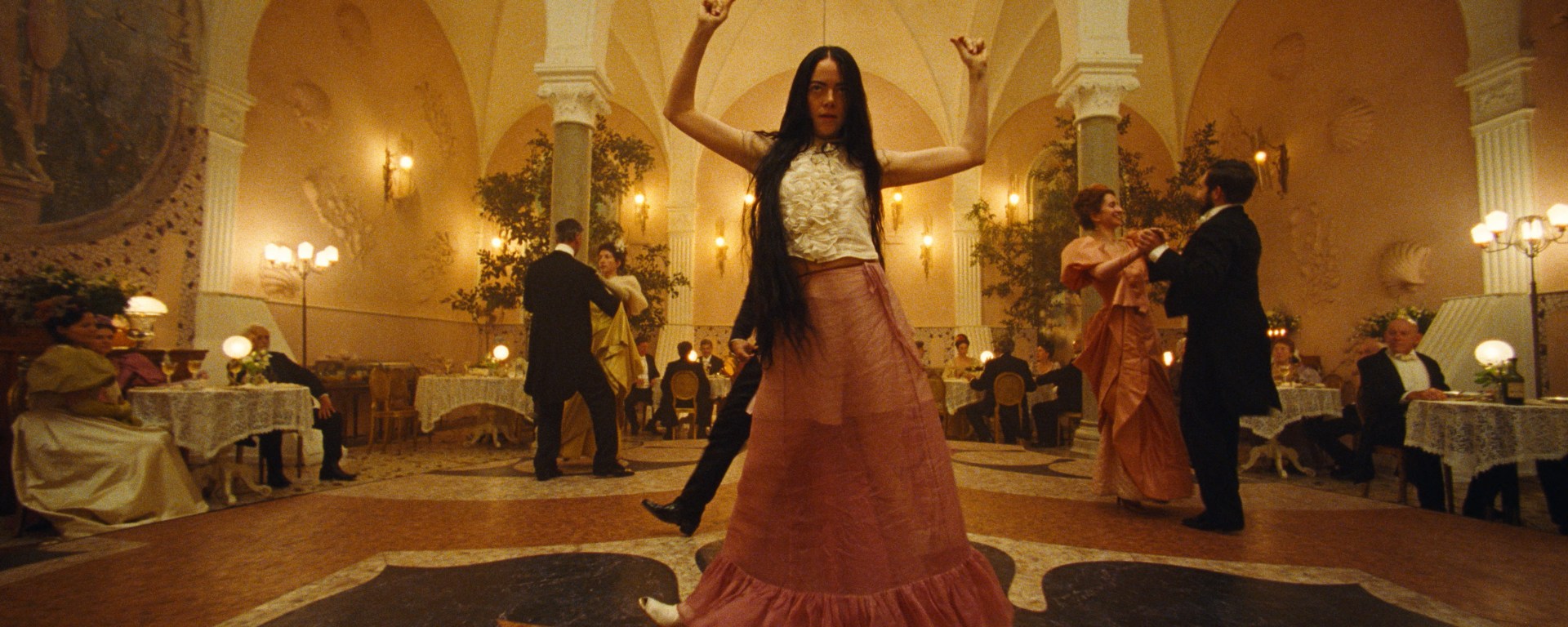 El estilo de Pobres Criaturas pasa por una estilización extrema de la forma, que, en ocasiones, parece inclinarse más por el uso de sus recursos como sello estético que por el propio objetivo expresivo que tienen detrás. Por ejemplo, el uso de los grandes angulares, que ya se trabajaban en La Favorita, aparece de manera mucho más evidente y extrema, de forma que algunos planos tienen una composición completamente circular. Sin embargo, podría debatirse su uso narrativo o «práctico», más allá del puro recurso estético, ya que después de los primeros tres cuartos de hora la sensación es que, bajo toda esta estilización, solo hay vacío. Luego, por los movimientos de cámara de Pobres Criaturas (diametralmente opuestos al estatismo de sus primeras películas), el griego recuerda a ratos a Stanley Kubrick, tanto por sus largos travellings como por una forma particular de pasar de planos cerrados a abiertos (o viceversa) mediante zooms. Es especialmente reseñable el uso que se le da a la banda sonora, que suena como una caja de música desafinada, y termina de dar ese punto descoordinado y torpe a la película, en paralelo a la forma que tiene Bella de moverse al principio de la historia. Al menos de forma superficial, Pobres Criaturas está cerca de ciertos trabajos de Terry Gilliam (por su estilización colorista y naif en busca del alejamiento de la realidad) o el goticismo de Tim Burton, trayendo de vuelta un tipo de cine que parecía no tener cabida en el mercado mainstream actual. La principal diferencia, no obstante, radica en que, al contrario de la plasticidad de los autores nombrados, Pobres Criaturas trabaja desde las posibilidades de lo digital, llevándolo a extremos (visibles en el tratamiento del cielo, el mar o los “fondos” de las ciudades, muy alejados de lo realista) que despiertan una sensación de novedad. Tal vez se viera algo similar en ciertas partes de Beau is Afraid y, sobre todo Annette, aunque de forma menos enfocada.