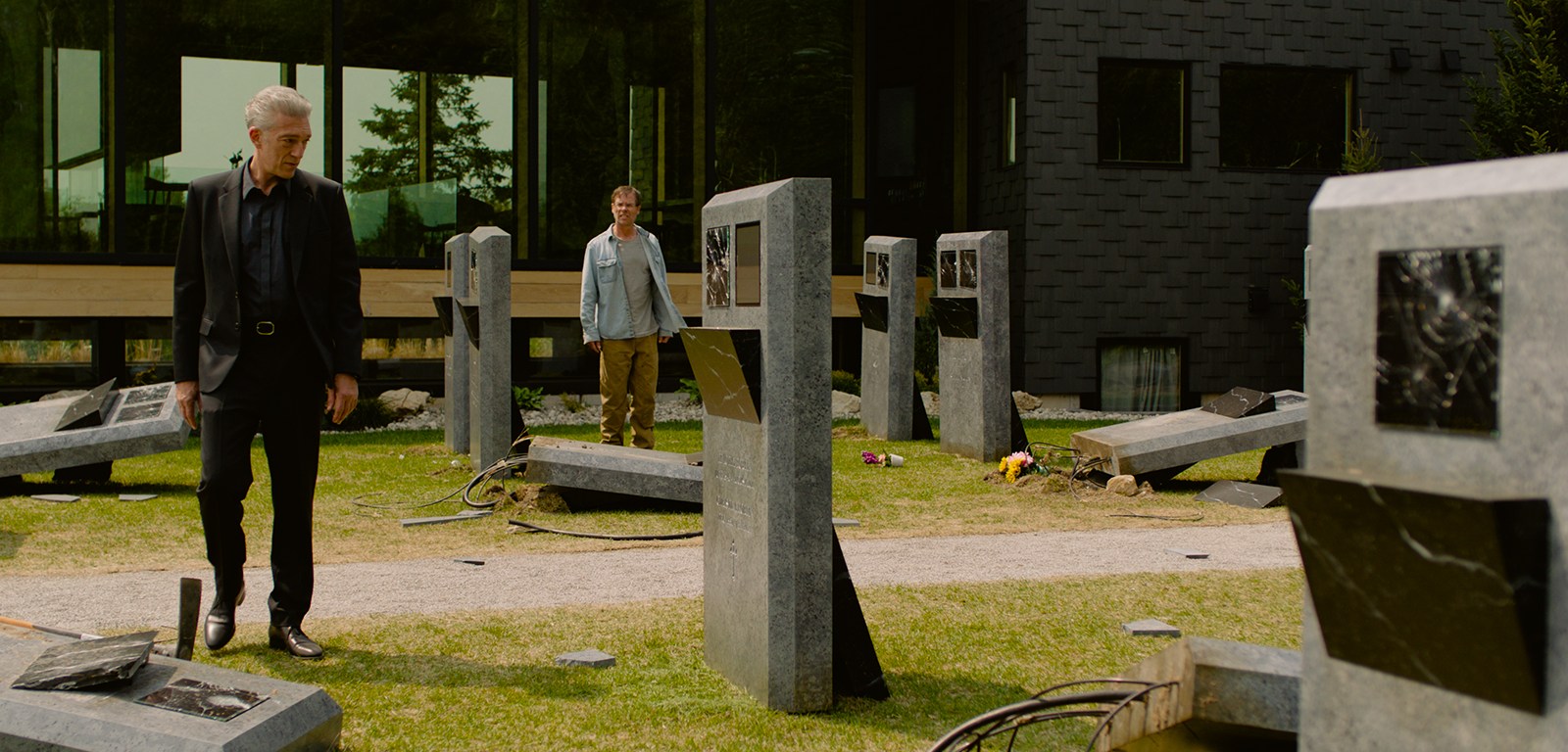 No porque sus película recientes no sea revolucionarias en lo representado (los primeros tres planos de Los sudarios, con la cámara habitando el espacio más allá del umbral de la muerte, se encuentran entre las imágenes más rigurosas de estos últimos años y uno de los puntos álgidos de su carrera) ni porque los temas hayan dejado de ser estimulantes o necesarios (los deseos del creciente nuevo autoritarismo de gobernar el cuerpo y el papel de la tecnología en el proceso), ni siquiera que haya dejado de mirar el cuerpo (en su última obra el cuerpo, o su ausencia, son la pieza fundamental de la cinta). Y, sin embargo, Los sudarios no parece una película de Cronenberg. Los diálogos parecen imponerse sobre las imágenes, sobre la estructura, sobre los personajes, sobre su cuerpo; la palabra erosiona la película hasta hacerla tan transparente como plana. Tampoco es exactamente una película «normal», pues se pueden rastrear decisiones narrativas que la separan de la gran masa audiovisual que consumimos. Cómo encuadra/monta algunas escenas concretas de diálogos, cómo rueda las escenas de sexo, la forma en que reincide en la omnipresencia de las pantallas o el ya mencionado inicio. No quiero que se malinterprete, considero el inicio de la cinta a la altura de obras como Videodrome, Crash o ExistenZ, pero aquí, el aparato conspirativo lleva a la cinta por otros derroteros que terminan por deshilachar el concepto y la imagen.